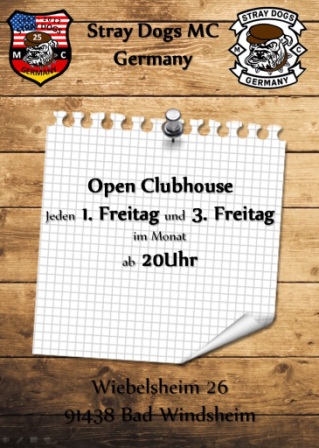 Das Clubhaus der Stray Dogs steht allen Besuchern jeden 1. und jeden 3. Freitag im Monat für Besuche offen. Gerne können sich hier auch interessierte über den Club informieren.